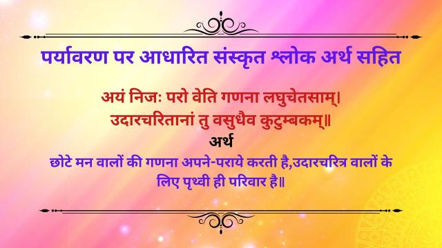 यह श्लोक पर्यावरण के महत्व को दर्शाता है। इसमें कहा गया है कि छोटे मन वाले लोग अपने और पराये की गणना करते हैं, जबकि उदारचरित्र वालों के लिए सभी मनुष्य पृथ्वी पर एक परिवार है। इस श्लोक से हमें पर्यावरण की महत्वपूर्णता को समझाता है और हमें स्थानीयता और सामान्यता के प्रति समझदारी और सहयोग के लिए प्रेरित करता है।